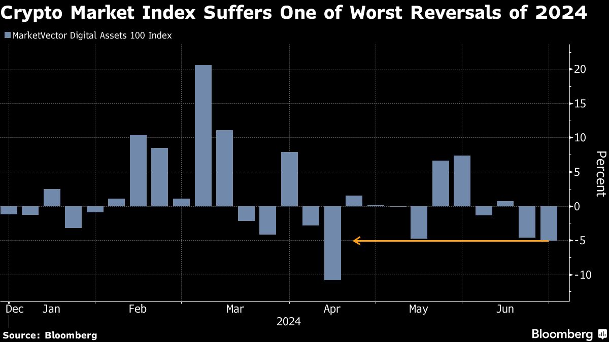 Losses are piling up in crypto after the digital-asset market’s second-worst weekly drop of 2024, a reflection of cooling demand for Bitcoin exchange-traded funds and uncertainty over monetary policy.