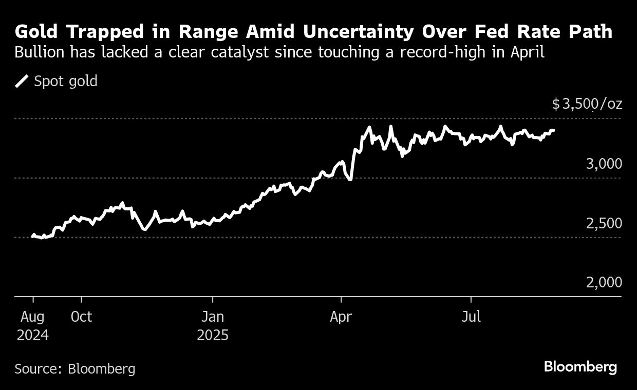 The precious metal has been largely rangebound since hitting a record above $3,500 an ounce in April, with the market looking for fresh catalysts following a blistering rally. Trade and geopolitical frictions, inflows to exchange-traded funds, and central bank moves to diversify away from the US dollar have aided bullion.