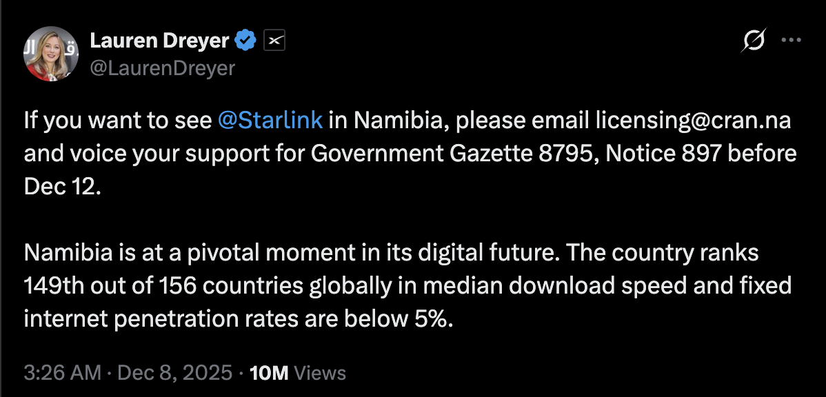 Starlink’s vice-president of business operations, Lauren Dreyer, took to Musk’s social-media platform X to call on Namibians to provide comment on the process. The company is the first to seek 100% foreign ownership in the country, the Namibian Sun reported in July.
