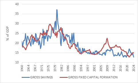 However, it will have to coincide with government borrowing declining relative to GDP. Government borrowing – dissaving – currently consumes a large portion of the domestic savings pool. This ‘crowds out’ private borrowers and raises interest rates, particularly because the market has a dim view of government’s creditworthiness.