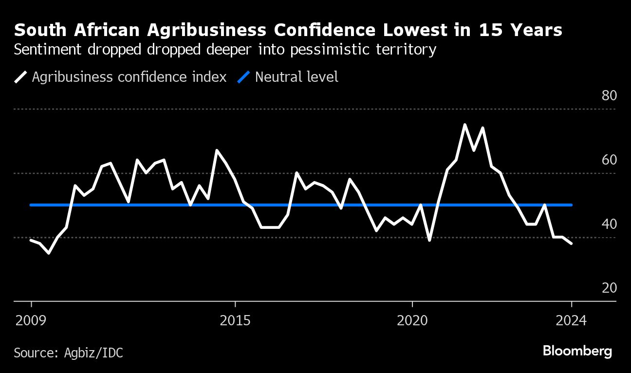 A confidence index compiled by the Agricultural Business Chamber, known as Agbiz, and the Industrial Development Corp. dropped to 38 in the three months through June. That’s the lowest level since the third quarter of 2009, Agbiz said in an emailed statement Monday.