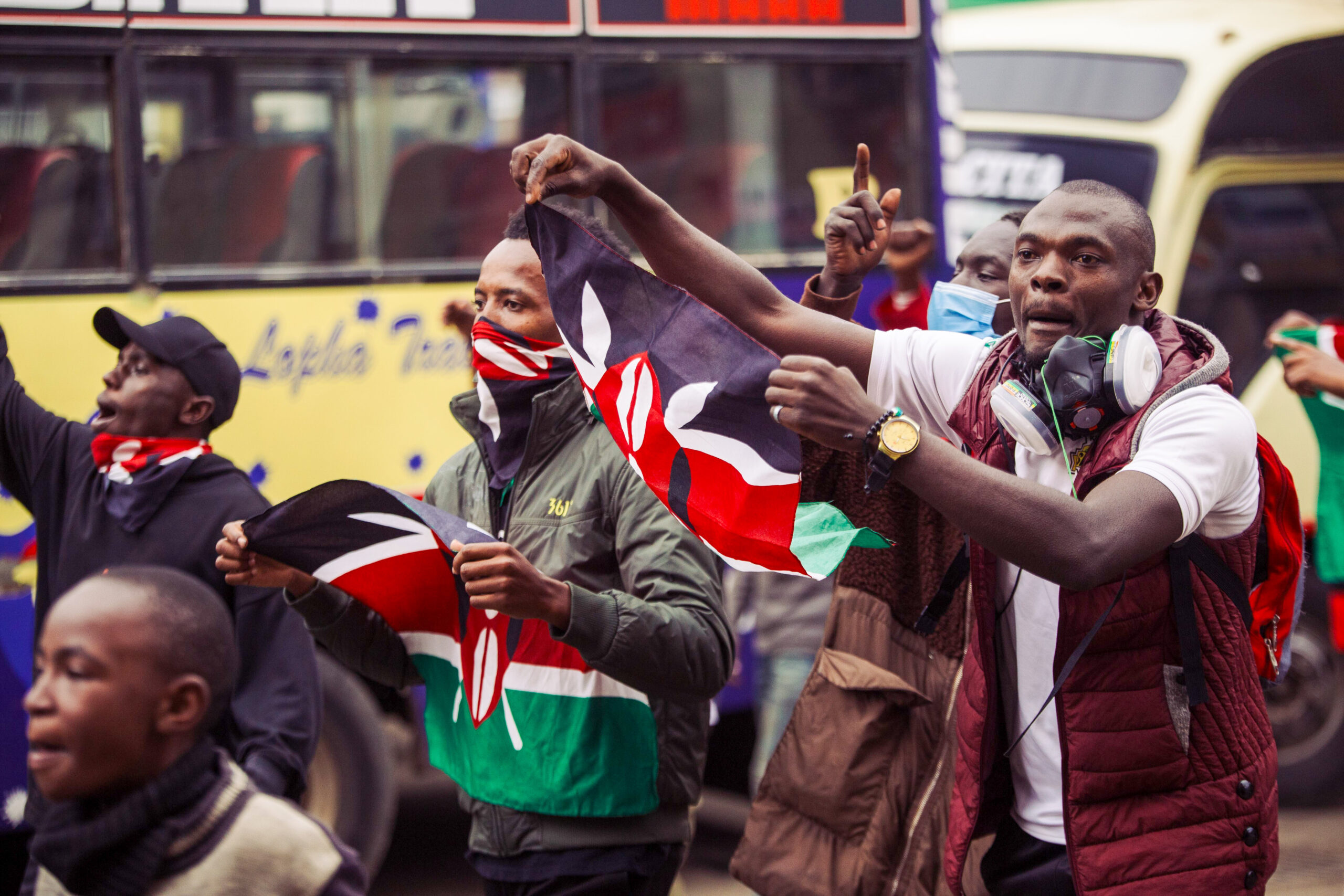 Anti-government protesters wave Kenya’s national flag during a demonstration in Nairobi’s central business district on Thursday, 8 August 2024. Image: Bloomberg